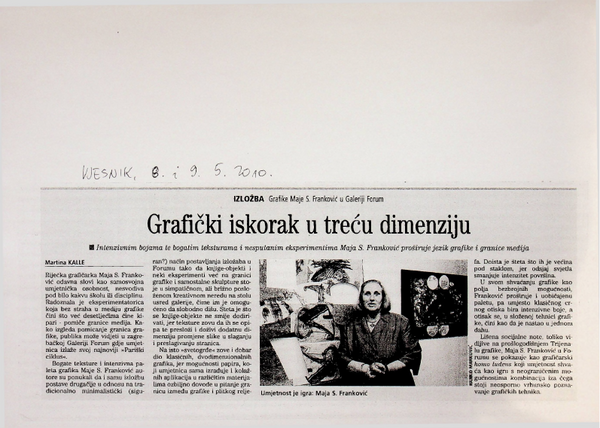 svibanj 2010. GRAFIČKI ISKORAK U TREĆU DIMENZIJU, Maja S. Franković, Galerija Forum Vrsta dokumenta: Novinski članak Djelatnost: Galerijska djelatnost Vjesnik, 08. svibnja 2010.Autor: nepoznatIzložba Maje S. Franković koja se održala u Galeriji Forum. Preuzmi dokument