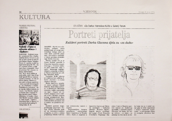 srpanj 2010. PORTRETI PRIJATELJA, Vatroslav Kuliš, Galerija Forum Vrsta dokumenta: Novinski članak Djelatnost: Galerijska djelatnost Vjesnik, 08. srpnja 2010.Autor: nepoznatIzložba Vatroslava Kuliša koja se održala u Galeriji Forum. Preuzmi dokument