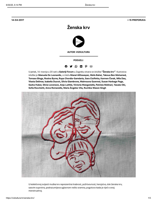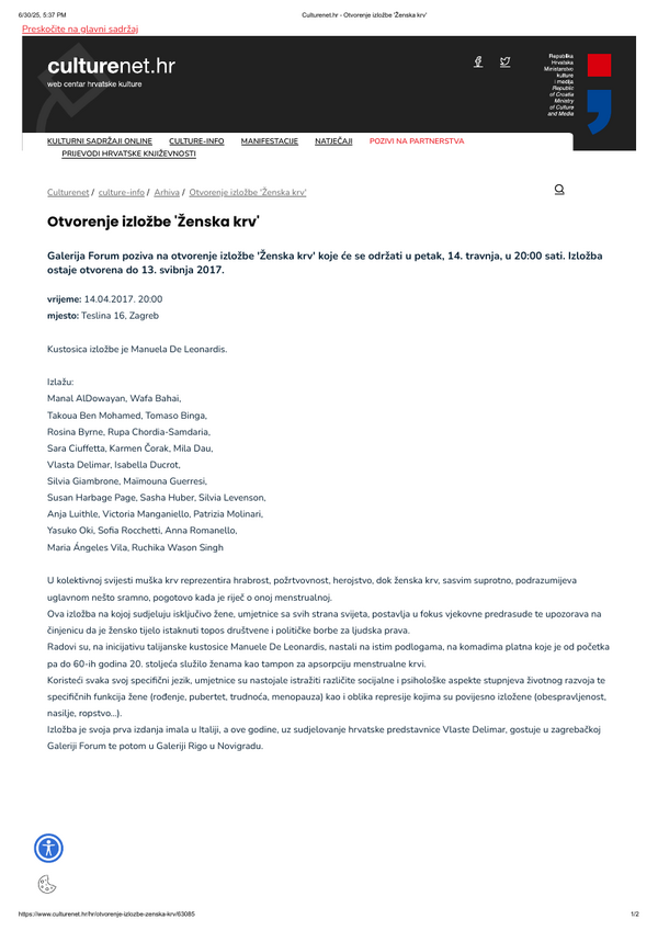 travanj 2017. ŽENSKA KRV, Grupna izložba, Galerija Forum Vrsta dokumenta: Novinski članak Djelatnost: Galerijska djelatnost Culturenet, 14. travnja 2017.Autor: nepoznatGrupna izložba koja se održala u Galeriji Forum. Preuzmi dokument