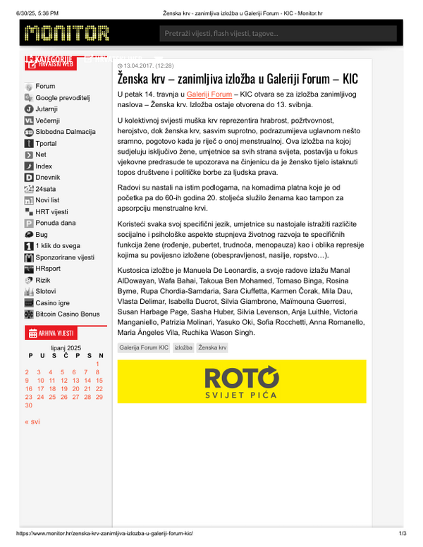 travanj 2017. ŽENSKA KRV, Grupna izložba, Galerija Forum Vrsta dokumenta: Novinski članak Djelatnost: Galerijska djelatnost Autor: Delimar, Vlasta Monitor, 13. travnja 2017.Autor: nepoznatGrupna izložba koja se održala u Galeriji Forum. Preuzmi dokument