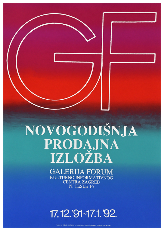 prosinac 1991. NOVOGODIŠNJA PRODAJNA IZLOŽBA, Galerija Forum Vrsta dokumenta: Plakat Djelatnost: Izdavaštvo Galerijska djelatnost Autor: Stančin, Ivo Galerija Forum, 17. prosinca 1991.Izložba koja je održana u Galeriji Forum.