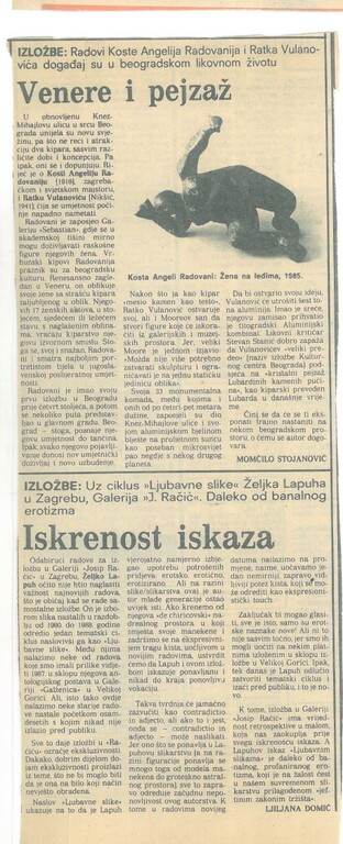 svibanj 1988. VENERE I PEJZAŽ, Kosta angeli Radovani i Rako Vulanović, Beograd Vrsta dokumenta: Novinski članak Djelatnost: Galerijska djelatnost Autor: Stojanović, Momčilo Vjesnik, 20.svibnja 1988.Autor: Momčilo StojanovićNaziv rubrike: Venere i pejzažOsvrt na izložbu kipara Koste Angeli Radovani i Ratka Vulanovića koja se održala u Beogradu u 1988.