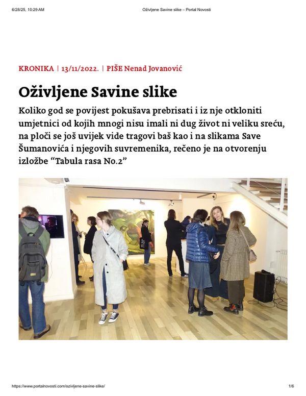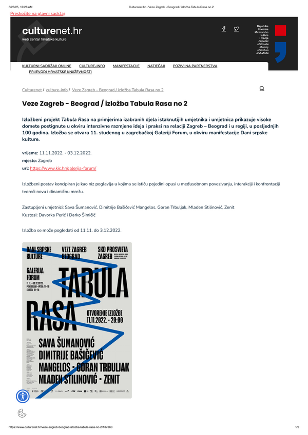 studeni 2022. TABULA RASA, Grupna izložba, Galerija Forum Vrsta dokumenta: Novinski članak Djelatnost: Galerijska djelatnost Novosti, 13. studenog 2022.Autor: Nenad JovanovićGrupna izložba koja se održala u Galeriji Forum. Preuzmi dokument