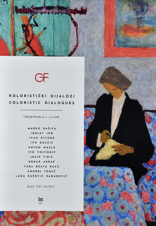 siječanj 2018. KOLORISTIČKI DIJALOZI, Grupna izložba, Galerija Forum Vrsta dokumenta: Plakat Djelatnost: Izdavaštvo Galerijska djelatnost Galerija Forum, 31. siječnja 2018.Izložba koja je održana u Galeriji Forum.