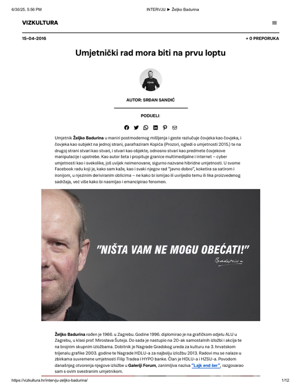 travanj 2016. LAJK END ŠER, Željko Badurina, Galerija Forum Vrsta dokumenta: Novinski članak Djelatnost: Galerijska djelatnost Vizkultura, 15. travnja 2016.Autor: nepoznatIzložba Željka Badurine koja se održala u Galeriji Forum. Preuzmi dokument