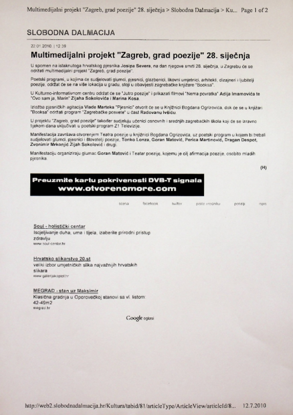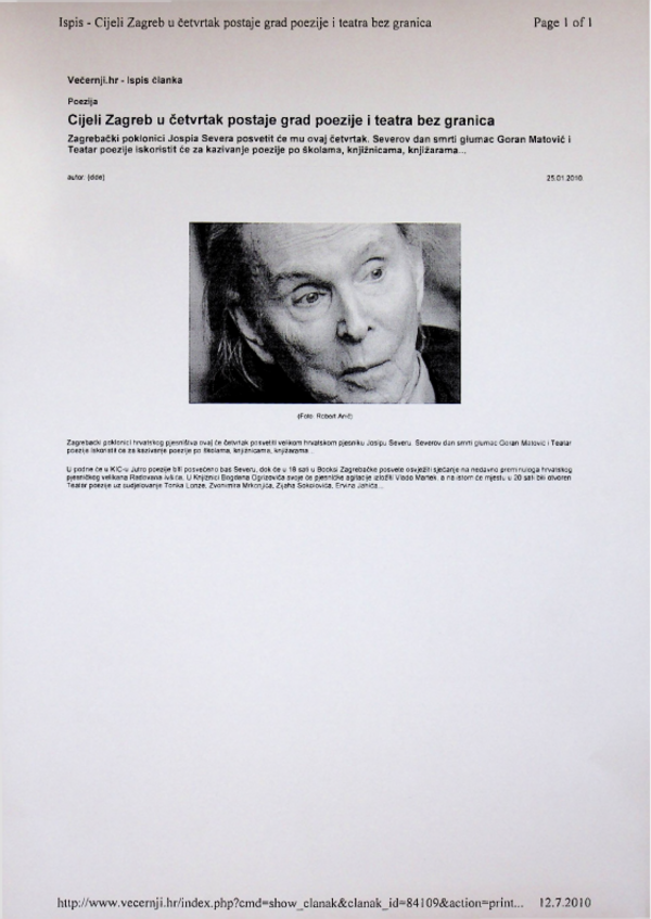 srpanj 2010. ZAGREB GRAD POEZIJE, Kulturno informativni centar Vrsta dokumenta: Novinski članak Djelatnost: Razgovori/Susreti Izdavaštvo Večernji, 12. srpnja 2010.Autor: nepoznatIzložba koja se održala u Kulturno informativnom centru. Preuzmi dokument