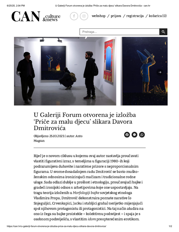 ožujak 2023. PRIČE ZA MALU DJECU, Davor Dmitrović, Galerija Forum Vrsta dokumenta: Novinski članak Djelatnost: Galerijska djelatnost Can, 25. ožujka 2023.Autor: Anto MagzanIzložba Davora Dmitrovića koja se održala u Galeriji Forum. Preuzmi dokument