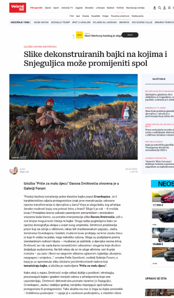 ožujak 2023. PRIČE ZA MALU DJECU, Davor Dmitrović, Galerija Forum Vrsta dokumenta: Novinski članak Djelatnost: Galerijska djelatnost Večernji list, 30. ožujka 2023.Autor: Maja CarIzložba Davora Dmitrovića koja se održala u Galeriji Forum. Preuzmi dokument
