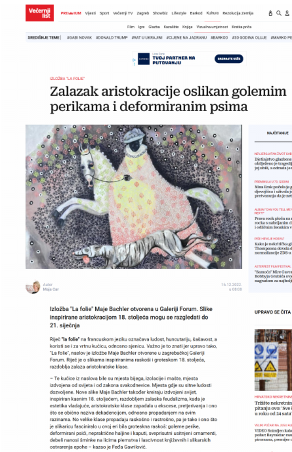 prosinac 2022. LA FOLIE, Maja Bachler, Galerija Forum Vrsta dokumenta: Novinski članak Djelatnost: Galerijska djelatnost Večernji list, 16. prosinca 2022.Autor: Maja CarIzložba Maje Bachler koja se održala u Galeriji Forum. Preuzmi dokument