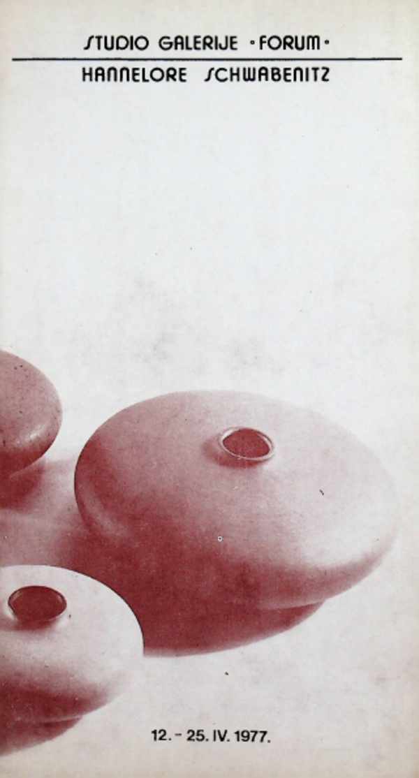 travanj 1977. HANNELORE SCHWABENITZ, Hannelore Schwabenitz, Studio Galerije Forum Vrsta dokumenta: Katalog Djelatnost: Izdavaštvo Galerijska djelatnost Studio Galerije Forum, 12. travnja 1977.Autor: Željko SabolKatalog izložbe Hannelore Schwabenitza koja se održala u Studiu Galerije Forum, . Preuzmi dokument