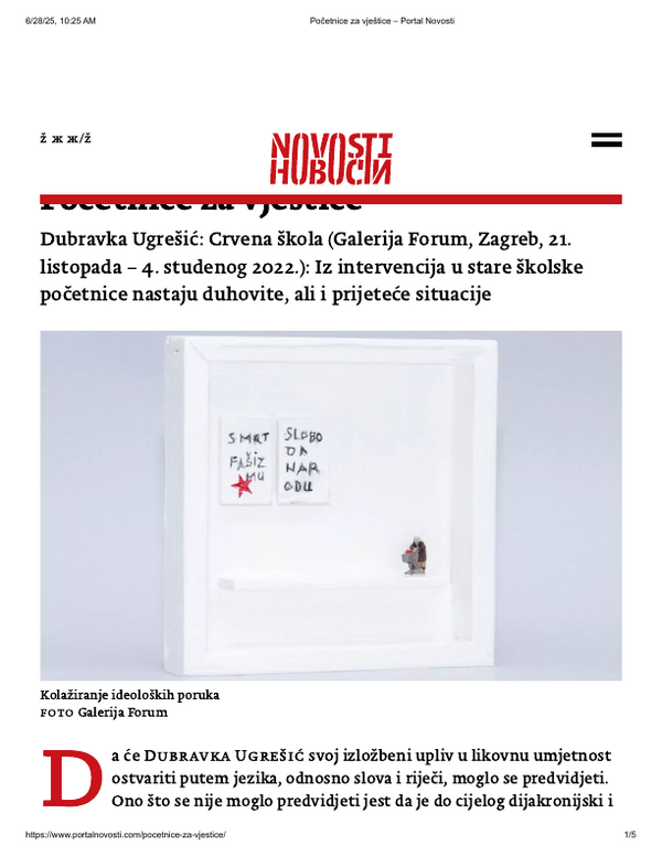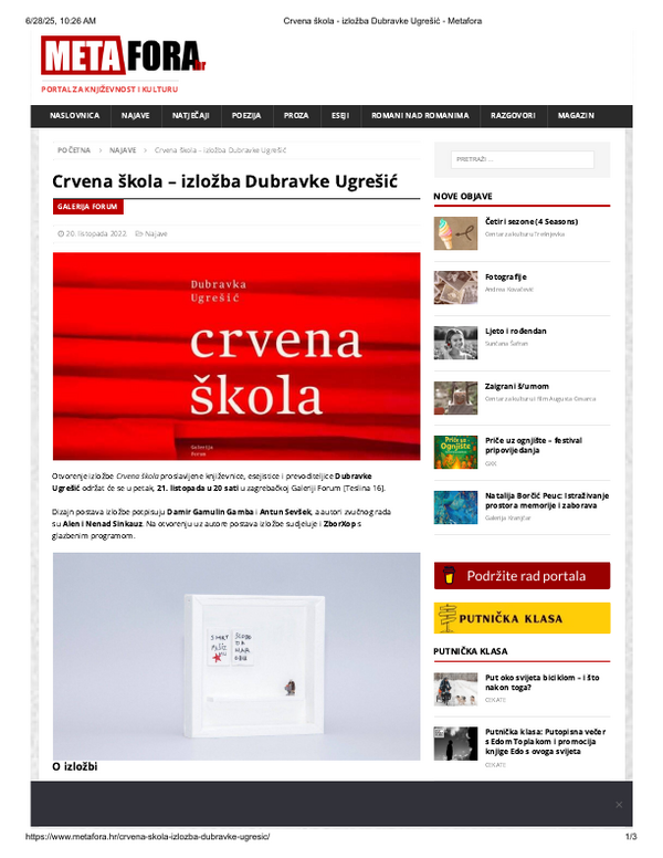 listopad 2022. CRVENA ŠKOLA, Dubravka Ugrešić, Galerija Forum Vrsta dokumenta: Novinski članak Djelatnost: Galerijska djelatnost Metafora, 20. listopada 2022.Autor: nepoznatIzložba Dubravke Ugrešić koja se održala u Galeriji Forum. Preuzmi dokument