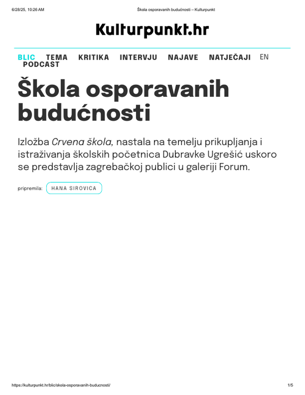 listopad 2022. CRVENA ŠKOLA, Dubravka Ugrešić, Galerija Forum Vrsta dokumenta: Novinski članak Djelatnost: Galerijska djelatnost Kulturpunkt, 26. listopada 2022.Autor: Hana SirovicaIzložba Dubravke Ugrešić koja se održala u Galeriji Forum. Preuzmi dokument
