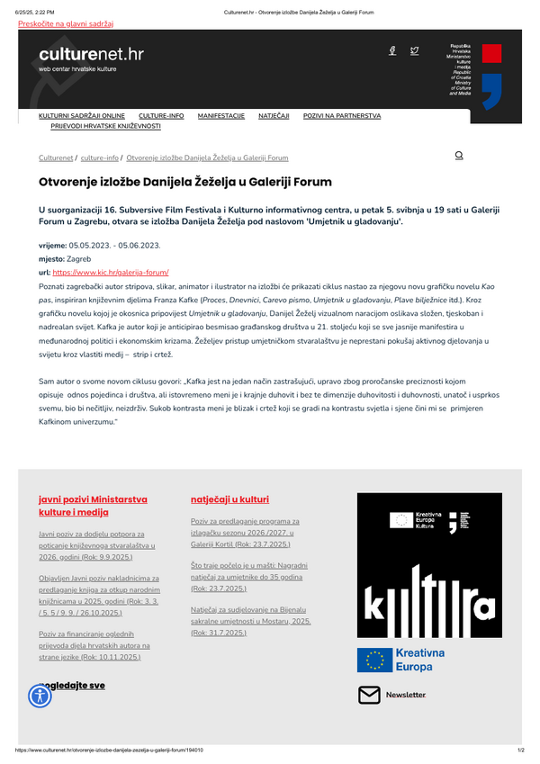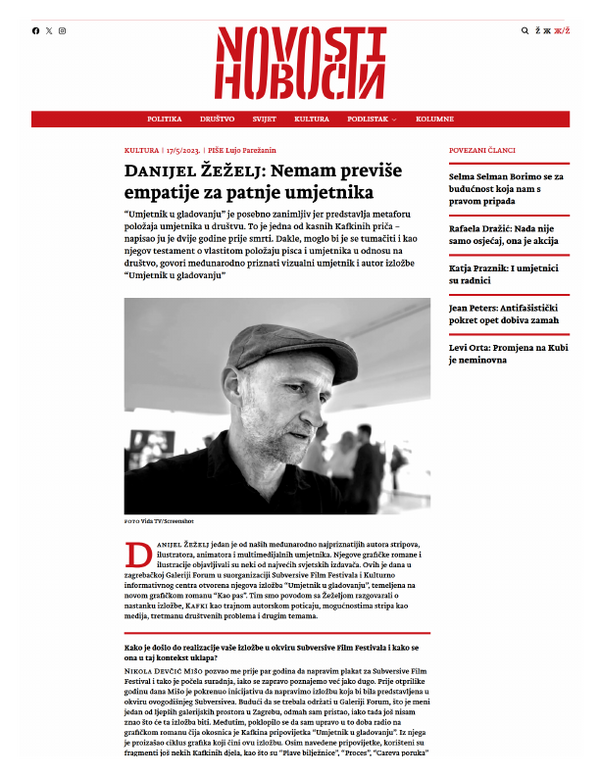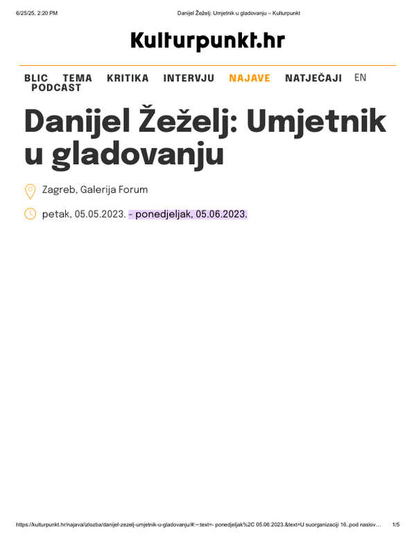 svibanj 2023. UMJETNIK U GLADOVANJU, Danijel Žeželj, Galerija Forum Vrsta dokumenta: Novinski članak Djelatnost: Galerijska djelatnost Kulturpunkt, 05. svibnja 2023.Autor: nepoznatIzložba Danijela Žeželja koja se održala u Galeriji Forum. Preuzmi dokument
