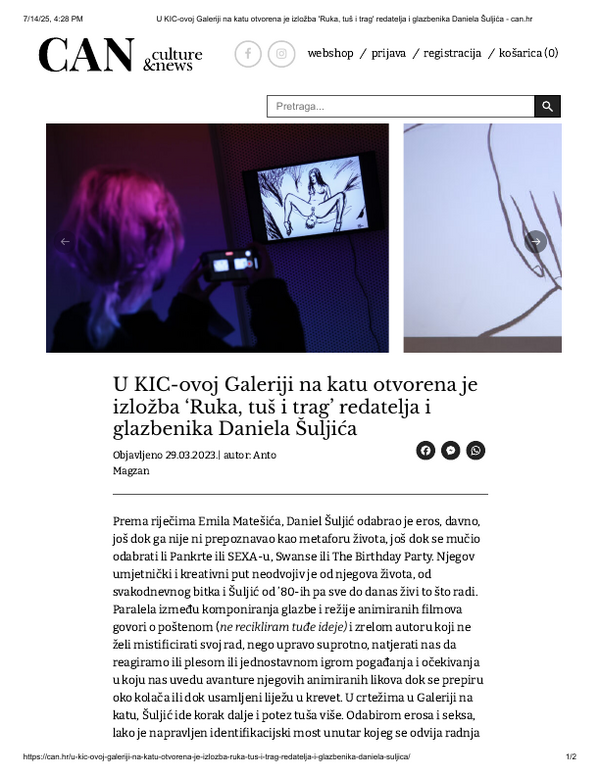 ožujak 2023. RUKA, TUŠ I TRAG, Daniel Šuljić, Galerija Forum Vrsta dokumenta: Novinski članak Djelatnost: Galerijska djelatnost Can, 29. ožujka 2023.Autor: Anto MagzanIzložba Daniela Šuljića koja se održala u Galeriji Forum. Preuzmi dokument