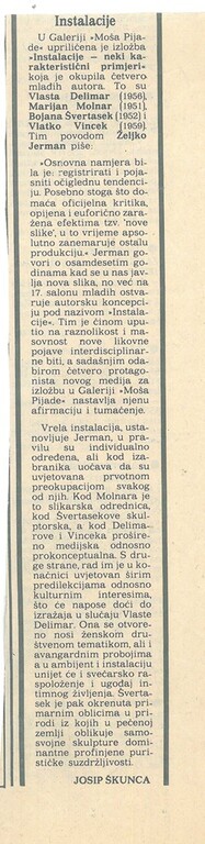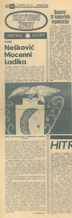 Komentar na izložbu Predraga Neškovića koja se odvila u Galeriji Forum u lipnju 1974, Gualtiero Mocceni koji je izlagao u 1935. u Studiu Galerije Forum te Ferdo Ladika koji je izlagao u 1914. u Salonu Hrvatskog društva likovnih umjetnika