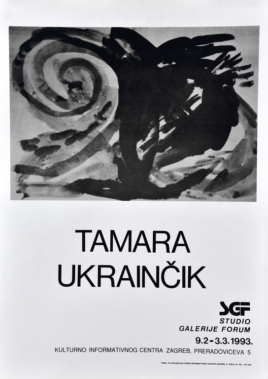 veljača 1993. TAMARA UKRAINČIK, Tamara Ukrainčik, Studio Galerije Forum Vrsta dokumenta: Plakat Djelatnost: Izdavaštvo Galerijska djelatnost Autor: Stančin, Ivo Studio Galerije Forum, 09. veljače 1993.Plakat izložbe Tamare Ukrainčik koja je održana u Studiu Galerije Forum.