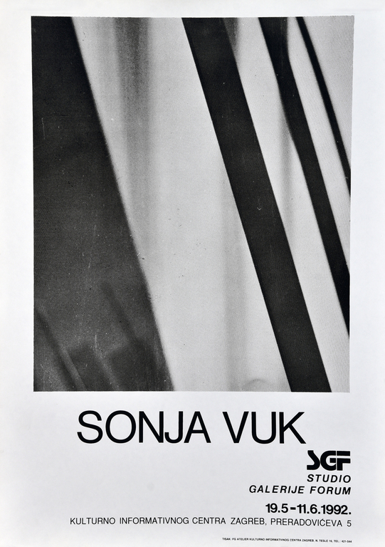 svibanj 1992. SONJA VUK, Sonja Vuk, Studio Galerije Forum Vrsta dokumenta: Plakat Djelatnost: Izdavaštvo Galerijska djelatnost Autor: Stančin, Ivo Studio Galerije Forum, 19. svibnja 1992.Plakat izložbe Sonje Vuk koja je održana u Studiu Galerije Forum.