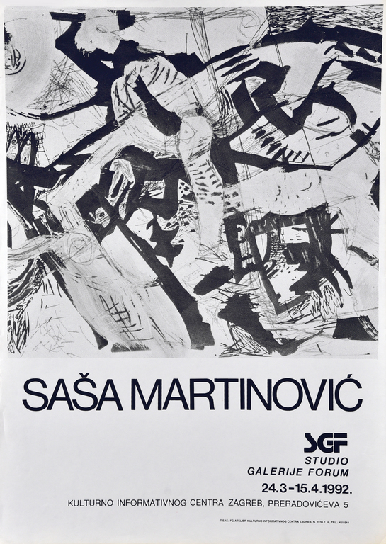 ožujak 1992. SAŠA MARTINOVIĆ, Saša Martinović, Studio Galerije Forum Vrsta dokumenta: Plakat Djelatnost: Izdavaštvo Galerijska djelatnost Autor: Stančin, Ivo Studio Galerije Forum, 24. ožujka 1992.Plakat izložbe Saše Martinović koja je održana u Studiu Galerije Forum.