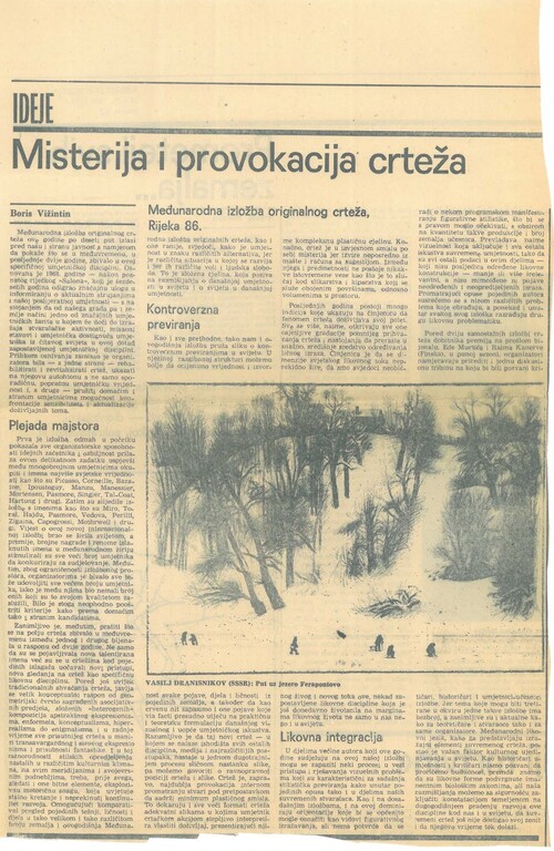 lipanj 1986. MISTERIJA I PROVOKACIJA CRTEŽA, Boris Vižintin, Vasilj Dranisnikov, Galerija Forum Vrsta dokumenta: Novinski članak Djelatnost: Galerijska djelatnost Autor: Autor, Nepoznat 1. 17. lipnja 1986.Autor: nepoznatNaziv rubrike: Misterija i provokacija crtežaKomentari na međunarodnu izložbu originalnog crteža 1986. te razne umjetnike
