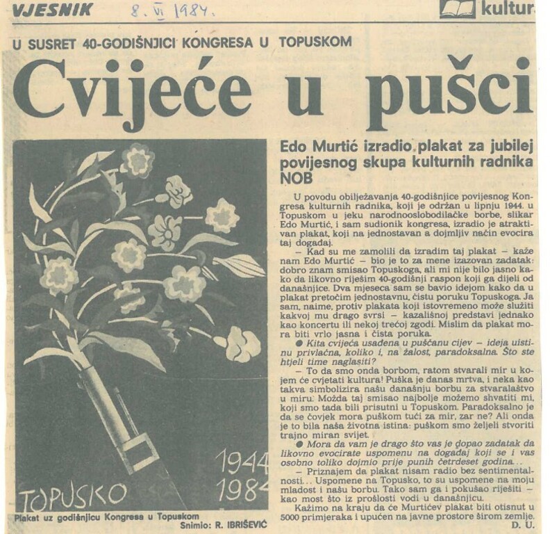 lipanj 1984. CVIJEĆE U PUŠCI, Edo Murtić, 40. godišnjica povijesnog Kongresa kulturnih radnika Vrsta dokumenta: Novinski članak Djelatnost: Galerijska djelatnost Autor: Autor, Nepoznat 1. Vjesnik, 08. lipnja 1984.Autor: D. U.Naziv rubrike: Cvijeće u pušciOsvrt na plakat Ede Murtića povodom 40. godišnjice povijesnog Kongresa kulturnih radnika
