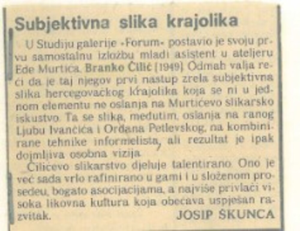 ožujak 1981. SUBJEKTIVNA SLIKA KRAJOLIKA, Branko Čilić, Galerija Forum Vrsta dokumenta: Novinski članak Djelatnost: Galerijska djelatnost Autor: Škunca, Josip Autor teksta: Josip ŠkuncaNaziv članka: "Subjektivna slika krajolika"Kratki osvrt na izložbu Branka Čilića koja se odvila u Studiju galerije Forum u razdoblju od 12. ožujka 1981. do 31. ožujka 1981.