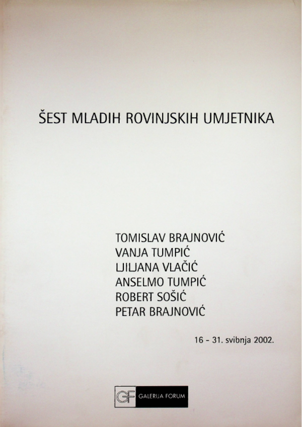 svibanj 2002. ROVINJSKI UMJETNICI, Grupna izložba, Galerija Forum Vrsta dokumenta: Katalog Djelatnost: Izdavaštvo Galerijska djelatnost Galerija Forum, 16. svibnja 2002.Autor: Milan BešlićKatalog grupne izložbe koje se održala u Galeriji Forum. Preuzmi dokument