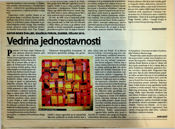 ožujak 2010. VEDRINA JEDNOSTAVNOSTI, Antun Boris Švaljek, Galerija Forum Vrsta dokumenta: Novinski članak Djelatnost: Galerijska djelatnost Vjesnik, 10. ožujka 2010.Autor: Marko KružićIzložba Antuna Borisa Švaljeka koja je održana u Galeriji Forum. Preuzmi dokument