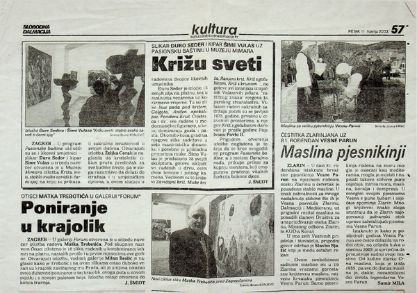 travanj 2003. TREBOTIĆ, Matko Trebotić, Galerija Forum Vrsta dokumenta: Novinski članak Djelatnost: Galerijska djelatnost Slobodna Dalmacija, 11. travnja 2003.Autor: Milan BešlićIzložba Matka Trebotića koja se održala u Galeriji Forum. Preuzmi dokument