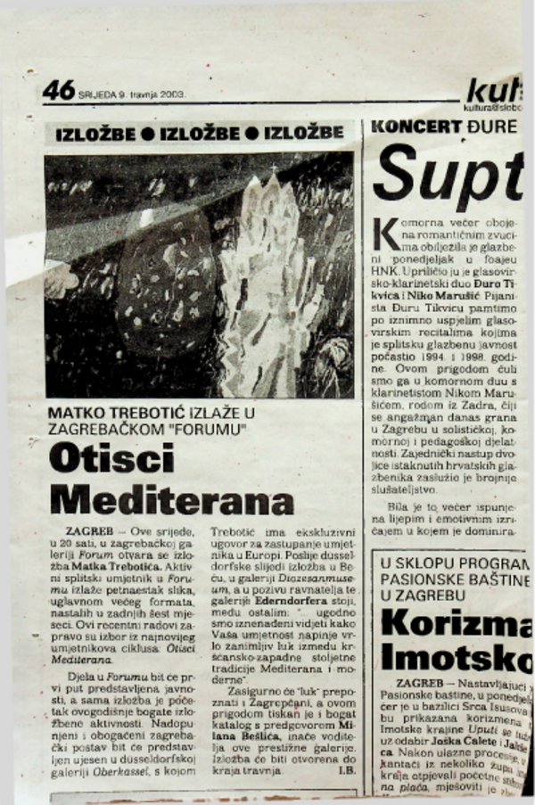 travanj 2003. OTISCI MEDITERANA, Matko Trebotić, Galerija Forum Vrsta dokumenta: Novinski članak Djelatnost: Galerijska djelatnost Slobodna Dalmacija, 09. travnja 2003.Autor: Milan BešlićIzložba Matka Trebotića koja se održala u Galeriji Forum. Preuzmi dokument