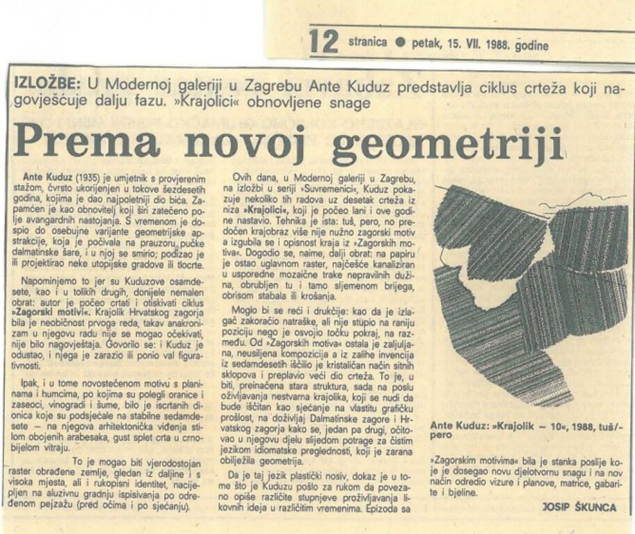 srpanj 1988. PREMA NOVOJ GEOMETRIJI, Ante Kuduz, Moderna galerija u Zagrebu Vrsta dokumenta: Novinski članak Djelatnost: Galerijska djelatnost Autor: Škunca, Josip Vjesnik, 15. srpnja 1988.Autor: Josip ŠkuncaNaziv rubrike: Prema novoj geometrijiKomentar na izložbu crteža Ante Kuduza koji su bili izloženi u Modernoj galeriji u Zagrebu u srpnju 1988.