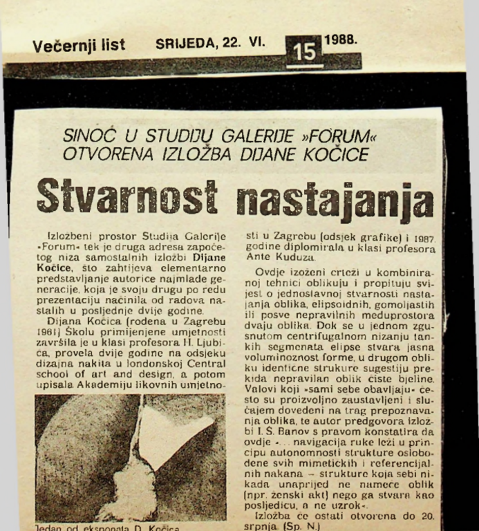 lipanj 1988. DIANA KOČICA, Diana Kočica, Studio Galerije Forum Vrsta dokumenta: Novinski članak Djelatnost: Galerijska djelatnost Večernji list, 22. lipnja 1988.Autor: Sp. N.Naziv članka: "Stvarnost nastajanja"Izložba Diane Kočica koja se održala u Studiju Galerije Forum.