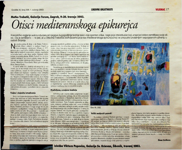 travanj 2003. TREBOTIĆ, Matko Trebotić, Galerija Forum Vrsta dokumenta: Novinski članak Djelatnost: Galerijska djelatnost Glas Koncila, 16. travnja 2003.Autor: Svjetlana MartinovićIzložba Matka Trebotića koja se održala u Galeriji Forum. Preuzmi dokument