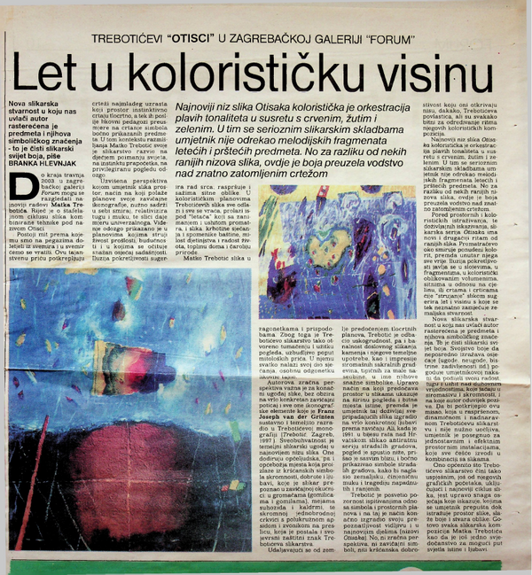 svibanj 2003. LET U KOLORISTIČKU VISINU, Matko Trebotić, Galerija Forum Vrsta dokumenta: Novinski članak Djelatnost: Galerijska djelatnost Vjesnik, 01. svibnja 2003.Autor: nepoznatIzložba Matka Trebotića koja se održala u Galeriji Forum. Preuzmi dokument