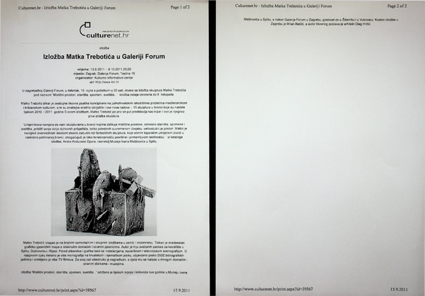 rujan 2011. IZLOŽBA MATKA TREBOTIĆA U GALERIJI FORUM, Matko Trebotić, Galerija Forum Vrsta dokumenta: Novinski članak Djelatnost: Galerijska djelatnost Culturnet, 15. rujna 2011.Autor: nepoznatIzložba Matka Trebotića koja se održala u Galeriji Forum. Preuzmi dokument